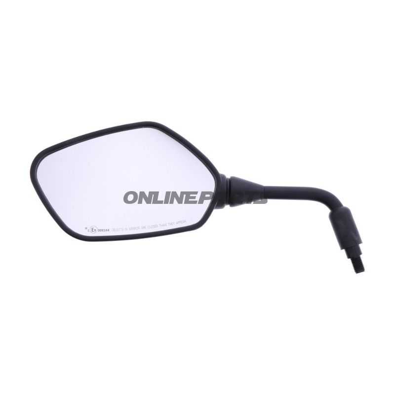 Der Spiegel ist auf der linken Seite des Motorrads angebracht und ermöglicht dem Fahrer, einen klaren Blick auf die Straße hinter ihm zu haben. Der rhombusförmige Spiegel hat eine Breite von 152 mm und eine Höhe von 96 mm, was eine gute Sicht gewährleistet. Das Design und die Platzierung des Spiegels sind wichtig, um tote Winkel zu minimieren, was für sicheres Fahren, insbesondere im Stadtverkehr oder auf Autobahnen, unerlässlich ist.