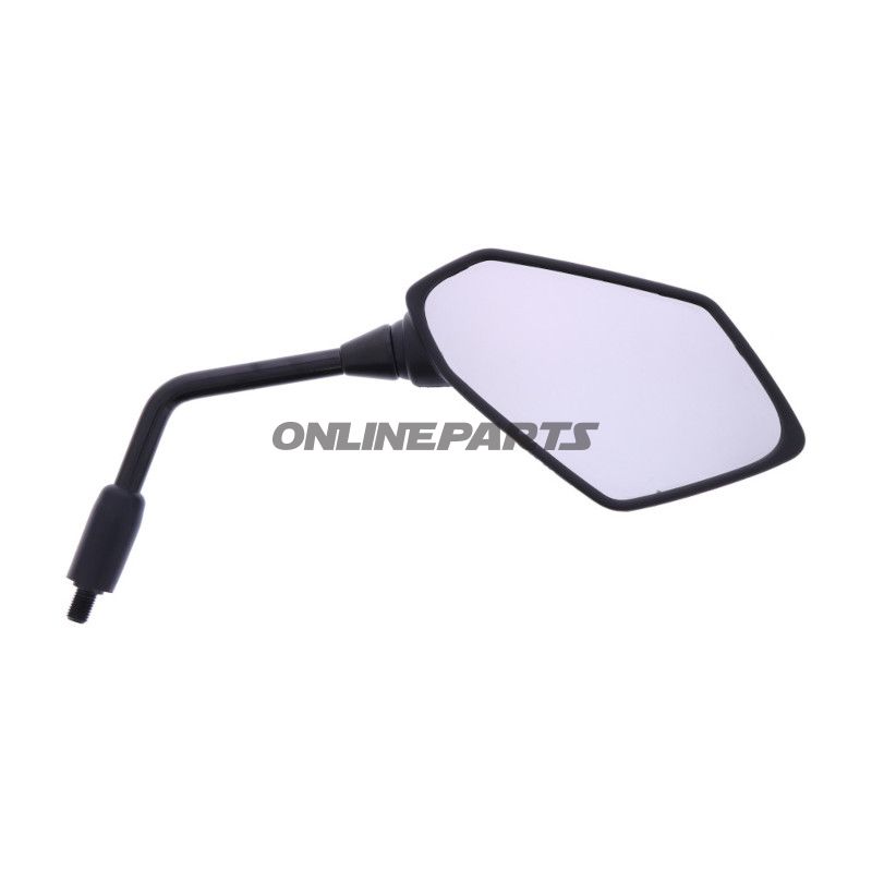 Der Spiegel ist mit einem rhombusförmigen Spiegelkopf ausgestattet, der 180 mm in der Breite und 93 mm in der Höhe misst. Die spezifische Montage ist für die rechte Seite des Motorrads vorgesehen und hat ein M10 x 1.25 Gewinde, was die Installation einfach und unkompliziert macht. Mit seinem eleganten schwarzen Design passt der Spiegel perfekt zu einer Vielzahl von Motorradtypen und ist aus Kunststoff gefertigt, was eine leichte, aber robuste Konstruktion gewährleistet.