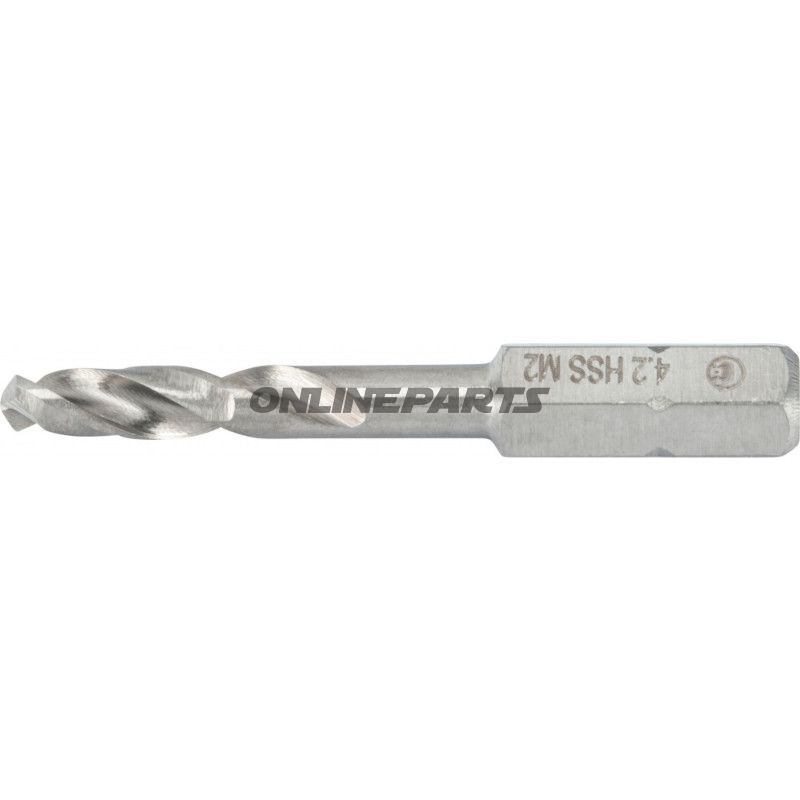Dieses Metallbohrer ist ein Dreherbohrer aus Schnellhartstahl (HSS-G M2) mit einem Schneiddurchmesser von 4,2 mm und einer Gesamtschneid- bzw. Gesamtlänge von ca. 45 mm. Der Bohrer ist mit einem 1/4" (6,35 mm) sechskantigen Antrieb versehen, was ihn geeignet macht für einen schnellen Austausch in Bohr- bzw. Bitshaltern, Schraubendrehern und Schlagbohrmaschinen mit Hex-Adapter.