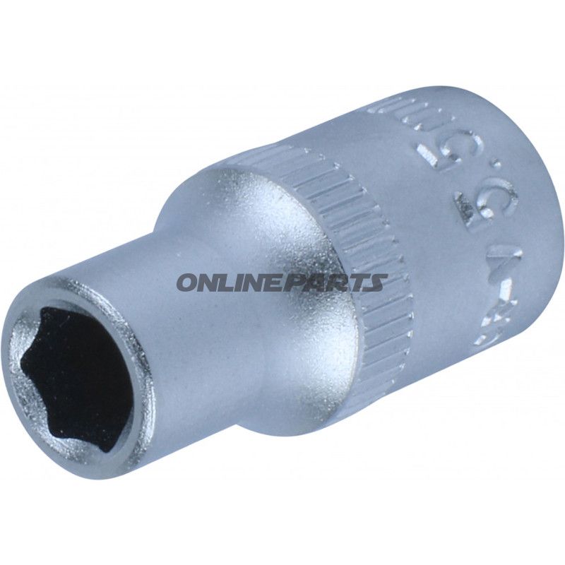 - Funktion: Überträgt ein Moment vom 1/4"-Antrieb am Drehmomentbolzen, dem Schwenkkopf oder Verlängerungsstab auf eine feststehende 5,5-mm-Sechskantverbindung. Das Profil sorgt für gleichmäßige Belastungsverteilung über die Flächen und vermindert das Risiko des Abrundens des Schraubenkopfes.