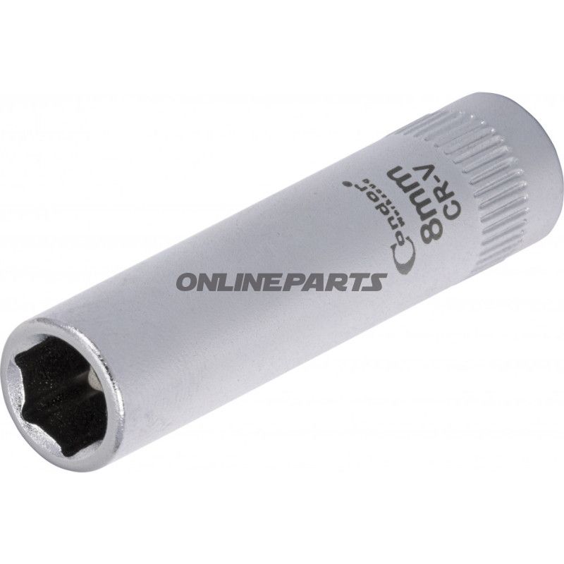 Dies ist ein spezialisiertes Steckschlüsselwerkzeug für Glühkerzen mit sechskantprofil und 8 mm Innenmaß, entwickelt für präzises Entfernen und Montieren von Glühkerzenstopfen in Dieselmotoren. Das Werkzeug ist für Wartungs- und Reparatureinsätze vorgesehen, bei denen Zugangsverhältnisse und die korrekte Auflagefläche wichtig sind, um eine Beschädigung der Glühkerze zu vermeiden.
