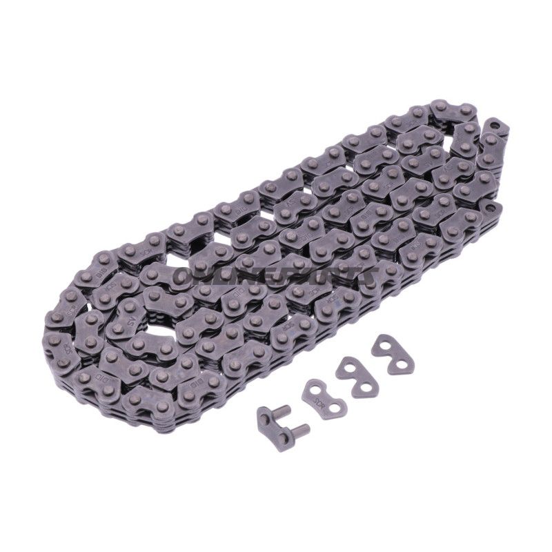 Die Kette ist aus hochwertigem Stahl gefertigt, der eine lange Haltbarkeit und Widerstandsfähigkeit gegen Verformung unter Belastung bietet. Die Materialwahl stellt sicher, dass die Kette den anspruchsvollen Bedingungen standhalten kann, denen ein Motorrad ausgesetzt ist, insbesondere bei hohen Drehzahlen und Belastungen. Die Kette ist so konzipiert, dass sie Reibung minimiert, was zu einem effizienten Motorbetrieb beiträgt und die Lebensdauer sowohl der Kette als auch der zugehörigen Komponenten verlängert.