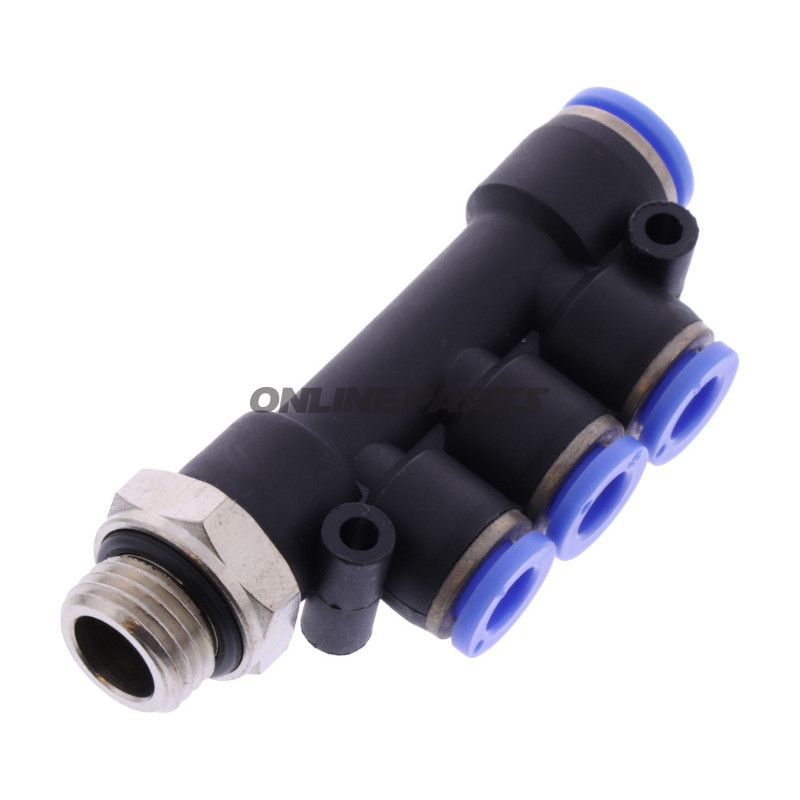 Produkt: T-male Distributør mit einem 8 mm Eingang und drei 6 mm Ausgängen. Hersteller: Riegler. Originalreferenzteilnummer bei Riegler: 109730 / 147.0146. Hersteller-Artikelnummer (MPN): 656.06.36.