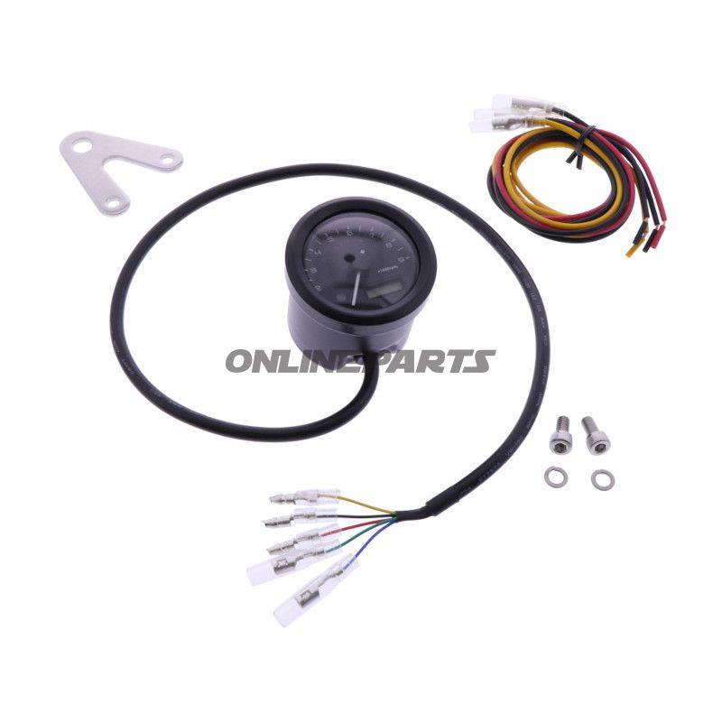 Produkt: Elektrischer Tachometer im 60 mm Gehäuse von Daytona. Dieser Tachometer kombiniert Geschwindigkeit anzeige mit Drehzahlmesserfunktionalität und ist zur Montage an Motorrädern, Rollern und anderen kleinen Fahrzeugen mit 12-Volt-Elektroanlage vorgesehen.