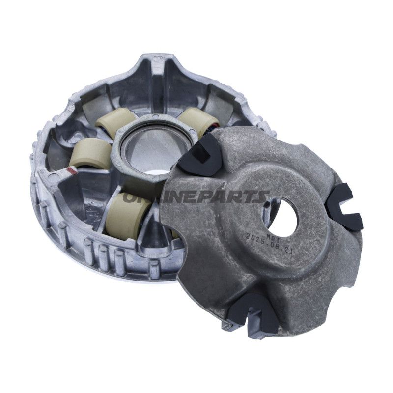 Die Variomatik ist Teil des automatischen Getriebes bei Rollern mit CVT-Antrieb und befindet sich zwischen dem Kurbelgehäuse des Motors und der Riemenscheibe des Sekundärantriebs. Sie überträgt die Motorleistung, indem sie den effektiven Durchmesser der Riemenscheiben verändert, was eine kontinuierlich variable Übersetzung für gleichmäßige Beschleunigung und stabile Motorumdrehungen bei unterschiedlichen Lasten gewährleistet.
