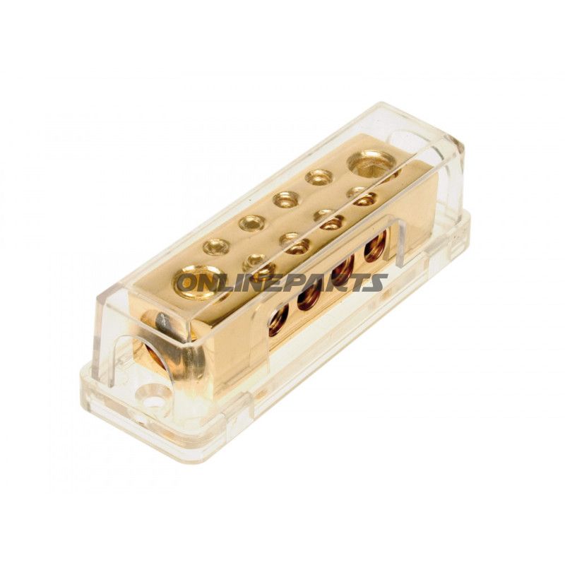 Material und Eigenschaften: Der Verteilerblock ist aus Metall gefertigt mit goldfarbenem Oberflächenfinish, was typischerweise auf eine kupferbasierte Legierung oder Vergoldung/ chemische Behandlung für verbesserte Leitfähigkeit und Korrosionsbeständigkeit hinweist. Die Materialwahl priorisiert elektrische Leitfähigkeit, geringe Übergangswiderstände und mechanische Haltbarkeit beim An- und Abmontieren von Ring- oder Kabelschuhen. Verbindungen und Schraubenkontakte sind so ausgelegt, dass sicherer Kontakt und einfache Wartung in installierter Position gewährleistet sind.