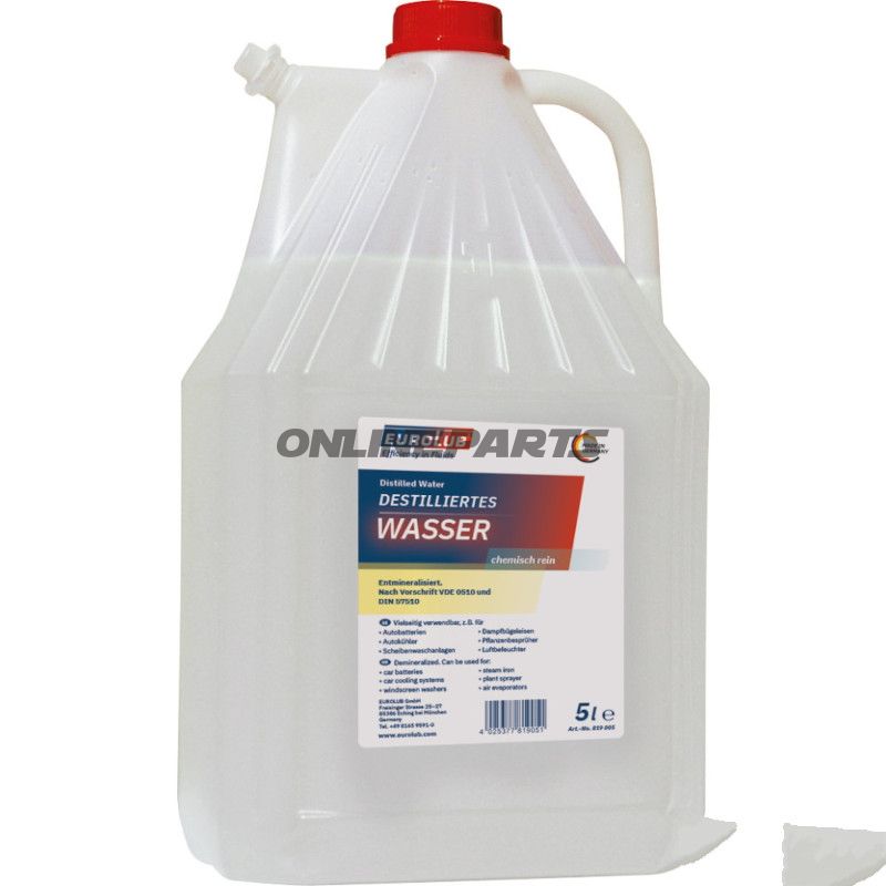 Produkt: Destilliertes Wasser in einer 5-Liter-Behälter (GTIN: 4025377819051, MPN: 559.00.05). Der Hersteller wird in den technischen Daten als Eurolub angegeben.