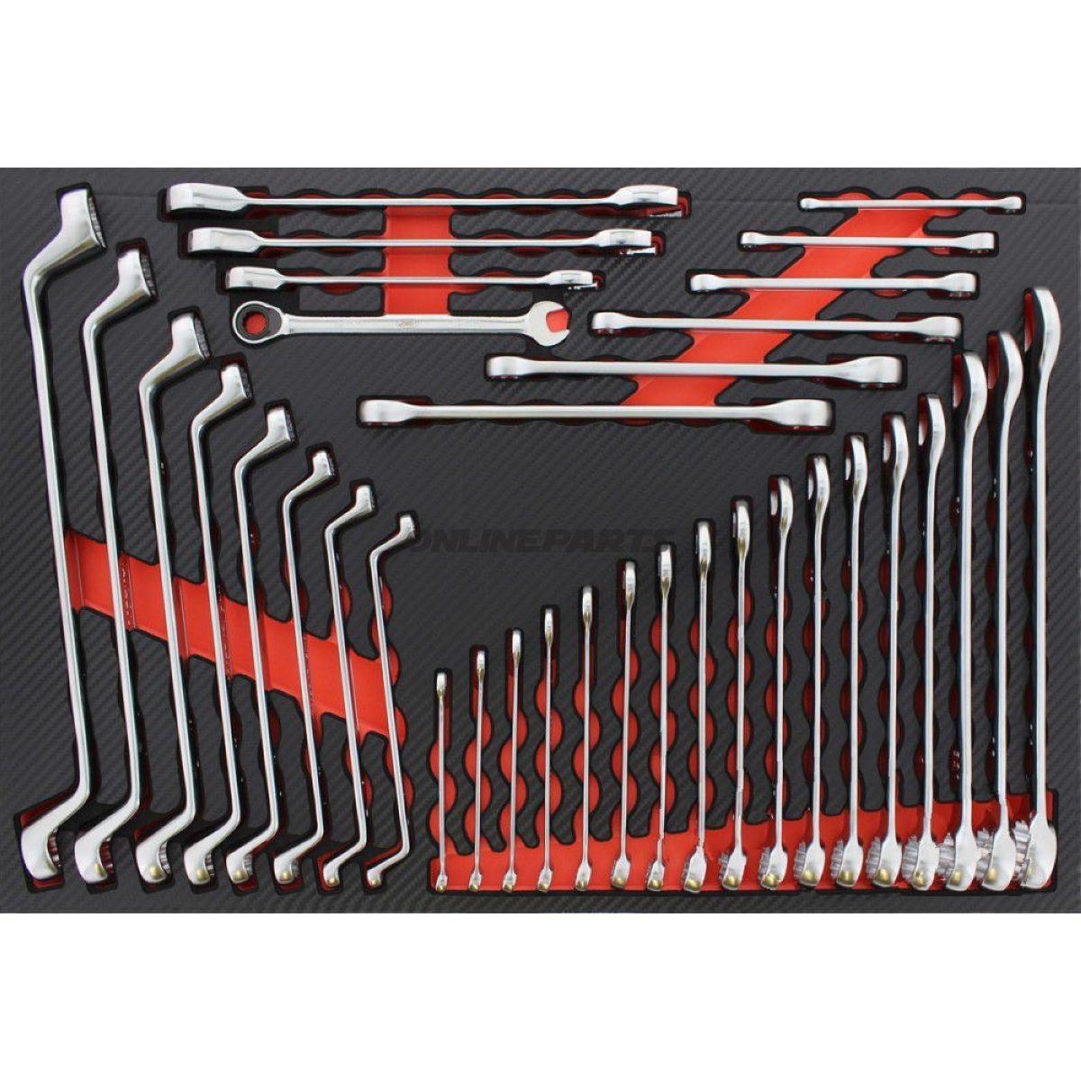 Produkt: Werkzeugset aus Schaumstoffeinlage von JMP (35 Teile). Dieses Set ist für den Einsatz in Werkstattrollen konzipiert, bei denen Werkzeuge in Schubladen- oder Koffereinlagen aufbewahrt werden, und bietet eine organisierte Lösung für gängige Befestigungsarbeiten an Motorrädern und Kleinmaschinen.