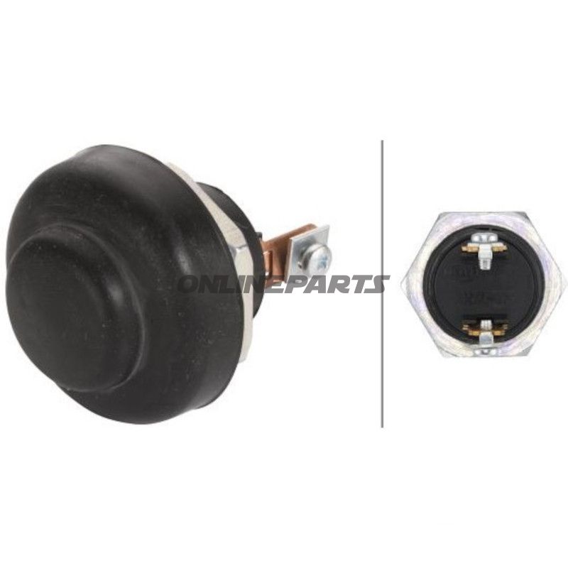 Zündschalter Hella 6JF 001 571-071 Druckknopf für Zündung/Start. Schwarz med Gummikappe, 2 Anschlüsse, max Wandstärke 5 mm, kurzfristige Belastung 12/24 V 20/15 A.